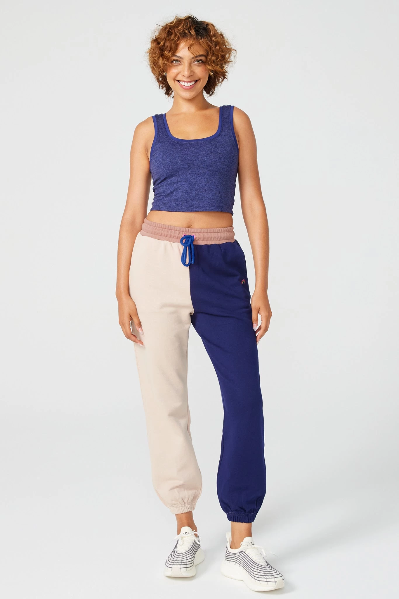 Stand out and stay cozy in two-tone sweatpants in Pima cotton. A contrasting waistband, pop drawstrings, and an embroidered rainbow icon complete this perfect relaxed fit.
